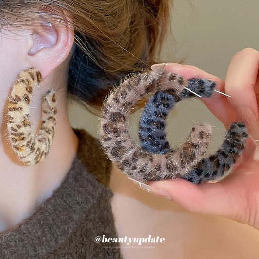 A廠【HE28904】925銀針秋冬毛絨豹紋幾何C形耳釘耳圈歐美復古耳環小眾設計感耳飾女 25.10-3