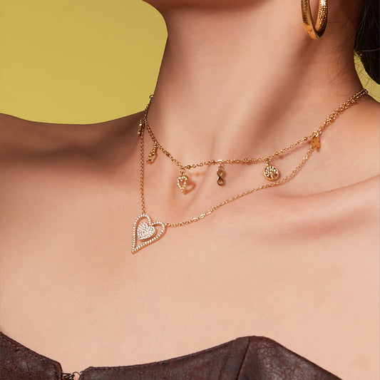 B廠【P874】跨境新款靈動愛心滿鑽鋯石吊墜雙層鎖骨項鍊不鏽鋼鍍18k金 25.11-4