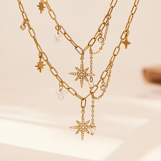 B廠【P1154】超閃八芒星5A鋯石吊墜手工鏈鎖骨項鍊不鏽鋼鍍18k真金飾品 25.11-4