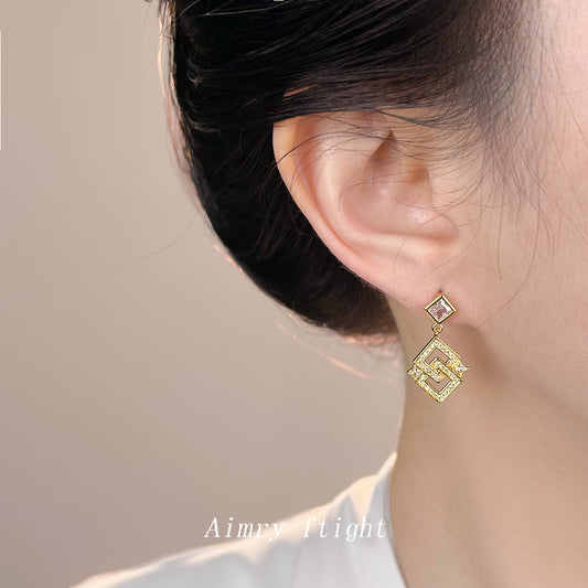 A廠【7197】原創高級感時尚幾何微鑲鋯石方形輕奢風925銀針鍍14K耳飾耳環 25.12-1