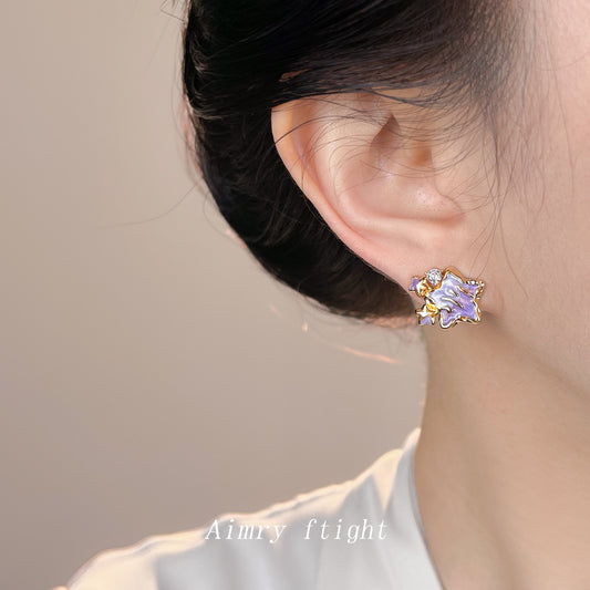 A廠【7200】原創琺瑯彩繪滴釉漸變色 925銀針鑲嵌鋯石紫色星星耳環個性耳飾女 25.12-1