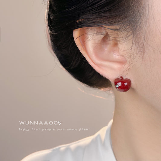A廠【7174】創意ins風925銀針琺瑯滴釉酒紅色蘋果耳環不對稱個性AB款耳飾 25.12-1