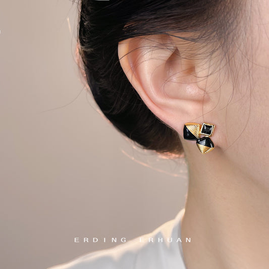 A廠【7182】原創時尚高級感925銀針黑色琺瑯滴釉幾何鋯石耳環女 通勤方形耳飾 25.12-1