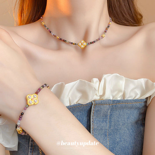 A廠【HN6685】彩色天然石串珠花朵手鍊項鍊套組復古小眾氣質鎖骨鏈時尚輕奢飾品 24.06-4