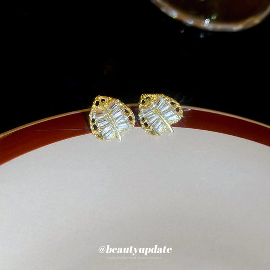 A廠【HE28814】925銀針超閃鑲鑽樹葉耳環時尚法式宮廷風氣質耳環輕奢高級感耳飾 25.10-1