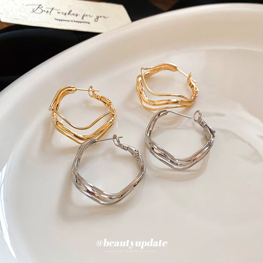A廠【HE28799】925銀針歐美波浪不規則圓形吊墜金屬耳圈時尚百搭耳環小眾設計感耳飾 25.10-1