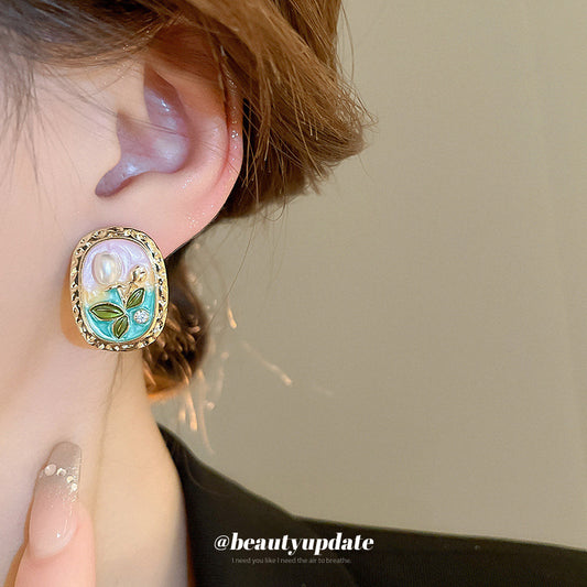 A廠【HE20333】925銀針橢圓花珍珠莫奈花園耳環法式復古宮廷風耳環甜美小清新耳飾 24.05-3