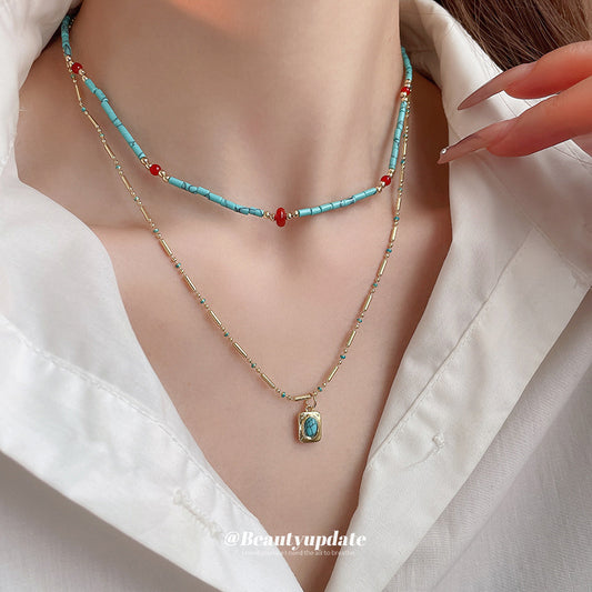 A廠【HN7233】波西米亞風人造石串珠雙層項鍊氣質時尚鎖骨鏈復古精緻高級感頸鍊 24.08-3