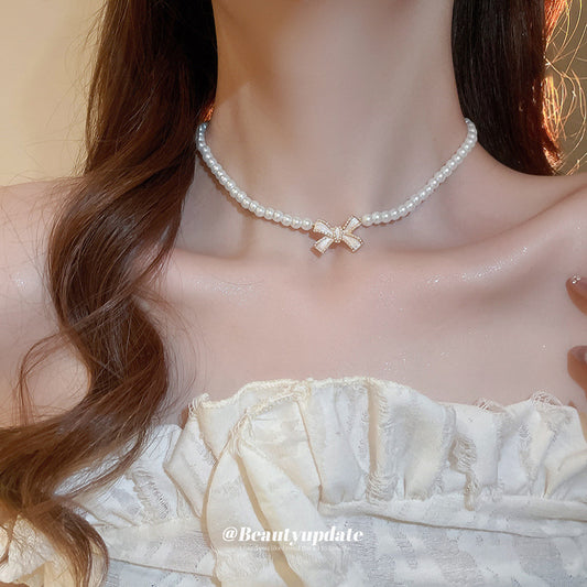 A廠【HN7282】法式輕奢滴油蝴蝶結珍珠串珠項鍊小眾簡約鎖骨鏈百搭高級感飾品女 24.08-4