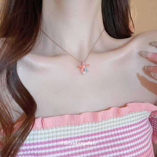 A廠【HN6246】少女心淡粉紅鋯石愛心項鍊精緻甜美蝴蝶結吊墜鎖骨鍊高級感時尚項鍊 24.05-4