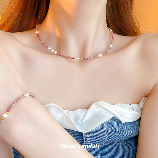 A廠【HN6765】鈦鋼不銹鋼紅紋石淡水珍珠項鍊手鍊套裝高級感鎖骨鏈小眾輕奢飾品 24.06-4