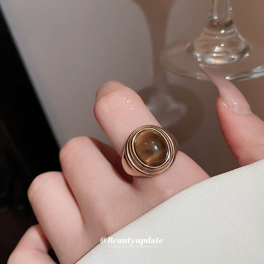 A廠【HR2211】18K厚金虎眼石橢圓開口戒指輕奢復古食指戒中古風高級感百搭手飾 24.08-3
