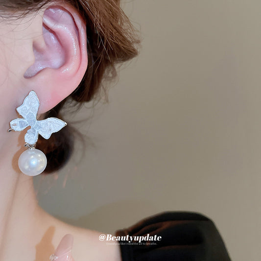 A廠【HE19506】925銀針水晶蝴蝶仿珍珠耳環簡約高級感ins風耳環小清新甜美精緻耳環女 24.04-1
