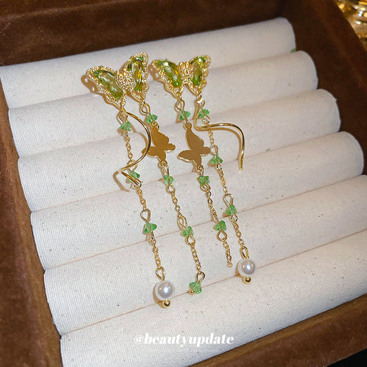 A廠【HE19641】925銀針綠鋯石蝴蝶流蘇耳環小清新甜美長版耳環高級感夏季耳飾 24.04-3