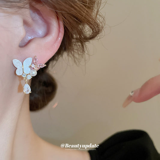 A廠【HE19561】925銀針蝴蝶仿珍珠水滴鋯石耳環甜美輕奢風新款耳環小清新時尚耳飾 24.04-2