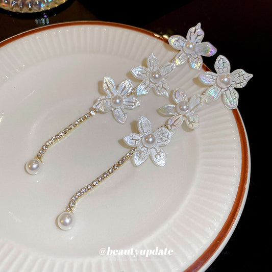 A廠【HE19512】925銀針仿珍珠鑲鑽花朵流蘇耳環優雅高級感長版耳環小眾時尚輕奢耳飾女 24.04-1