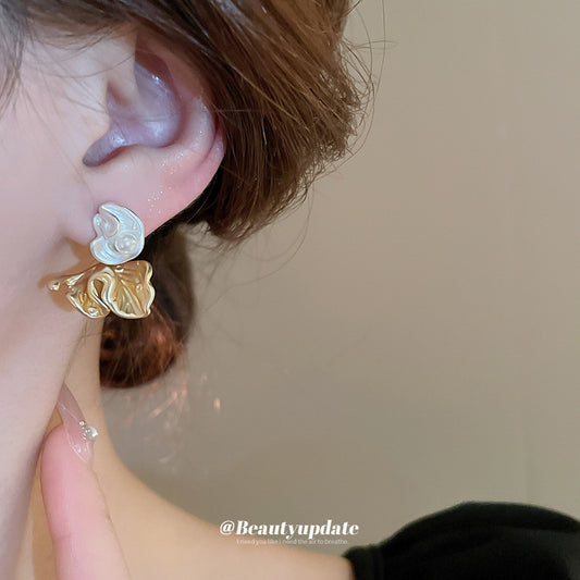 A廠【HE19649】925銀針簡約褶皺花朵仿珍珠耳環法式復古時尚百搭耳環高級感輕奢耳飾女 24.04-2