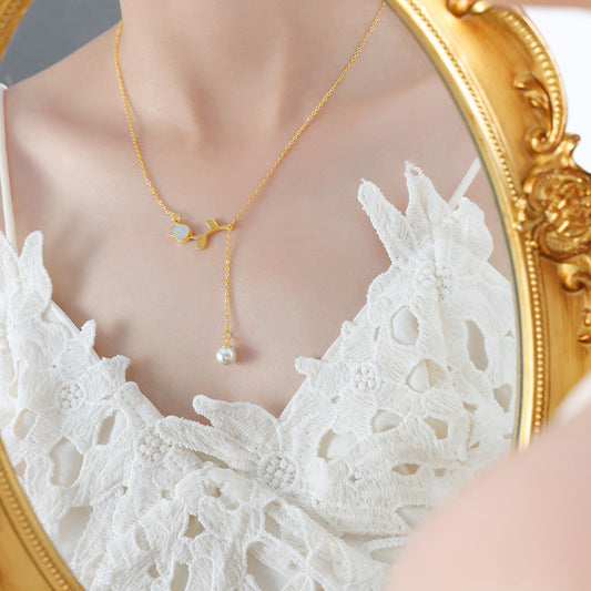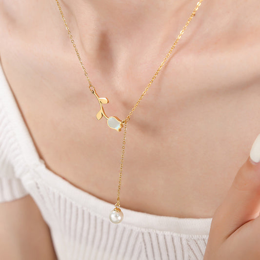 B廠【P1479】歐美跨境熱銷白海貝玫瑰花法式仿珍珠流蘇項鍊ins鎖骨鏈鈦鋼 23-07.10