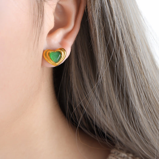 B廠【P1511-F875】歐美百搭復古愛心桃心形狀玻璃石貓眼石吊墜鈦鋼幾何項鍊耳環套裝 23-06.26