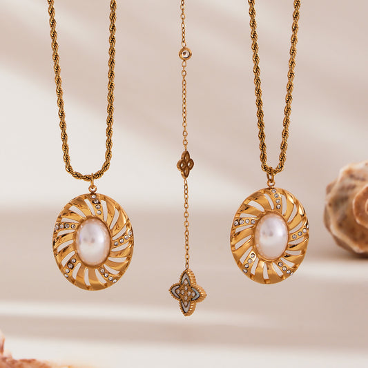 B廠【P155】不鏽鋼四葉花Y字流蘇鎖骨鏈鍍18k金精緻仿珍珠疊戴項鍊組合 25.09-4