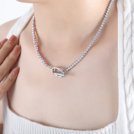 B廠【P1512】質感法式天然淡水珍珠不規則拼接鋯石鏈條情侶項鍊女鎖骨鏈鈦鋼 23-06.26
