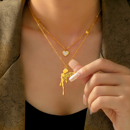 B廠【P1654】不鏽鋼愛心鑲嵌鋯石天使翅膀吊墜項鍊刀片鏈小鋼珠雙層疊戴 25.10-3