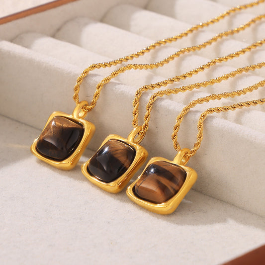 B廠【P1852】法式跨國個性方形鑲嵌虎眼石吊墜ins簡約小眾鈦鋼鍍18k金項鍊 24.07-1