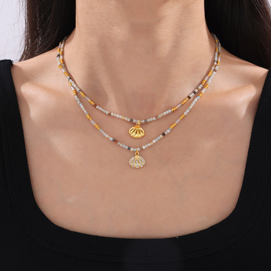 B廠【P1862】赫本風天然石串珠設計感項鍊貝殼鑲鋯石吊墜鈦鋼鍍金流行首飾 24.07-2