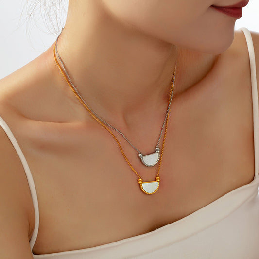B廠【P1848】法式跨國復古幾何半圓白海貝精緻吊墜鎖骨鍊色劑飾品鈦鋼18k金女 24.07-2