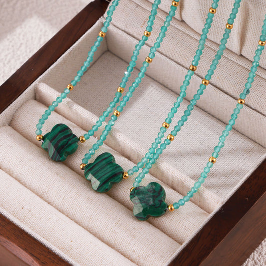 B廠【P1851】法式復古孔雀石花朵吊墜小眾個性ins風天然石鋼珠串珠優雅項鍊女 24.07-1