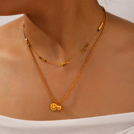 B廠【P1890】新款跨境復古個性鈦鋼鍍金鎖骨鏈鑲嵌仿珍珠吊墜時尚雙層項鍊飾品 24.01-1