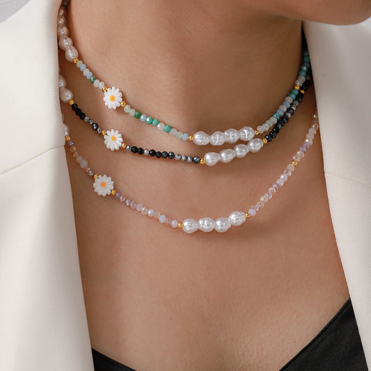 B廠【P1902】韓國網紅2024年新款小眾設計感貝珠水晶串珠撞色項鍊女小雛菊鋼珠 24.06-4