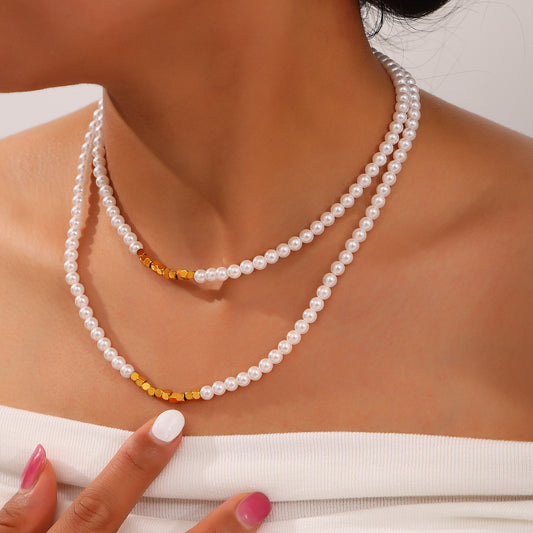 B廠【P1940】赫本風時尚簡約輕奢貝珠項鍊法式新款拼接幾何鈦鋼方糖配件頸鍊女 24.04-3