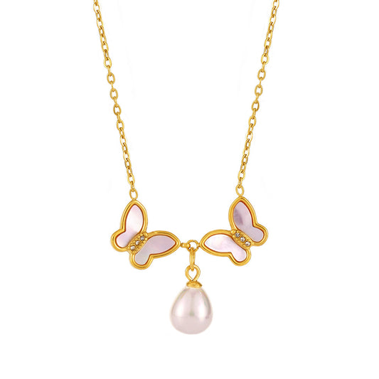 B廠【P2142】不鏽鋼天然貝殼雙蝴蝶鑲鑽貝珠鎖骨項鍊PVD電鍍18K真金飾品 25.01-1