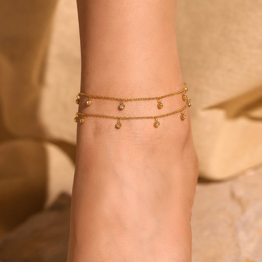 B廠【S030】ins小眾鏈條流蘇鋯石腳鍊歐美跨境新品雙層不鏽鋼鏈條飾品 25.09-1