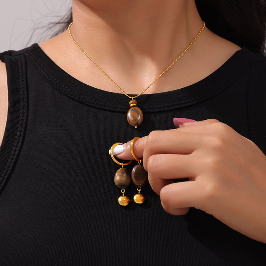 B廠【TXF041】美拉德風復古天然虎眼石幾何橢圓吊墜鈦鋼鍍18k金項鍊耳環套裝女 24.05-1