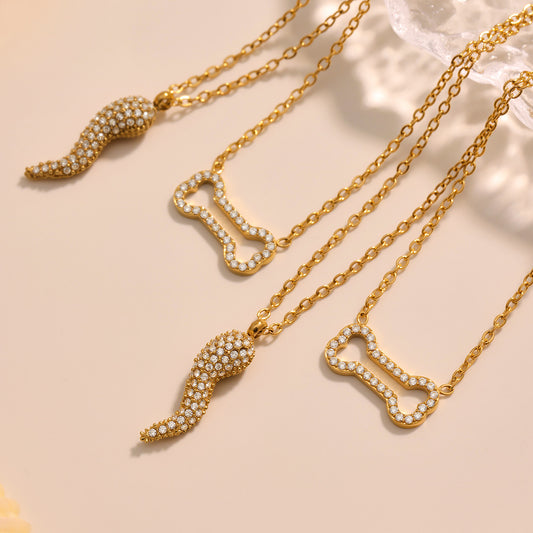 B廠【TXP342】全新中式飾品不銹鋼5A鋯石小辣椒狗骨頭個性雙層項鍊手鍊套裝 25.08-1