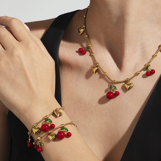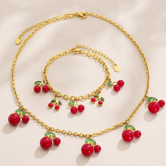 B廠【TXP341】新款車厘子吊墜項鍊手鍊手鍊套裝不銹鋼鍍18k真金歐美百搭首飾 25.08-1