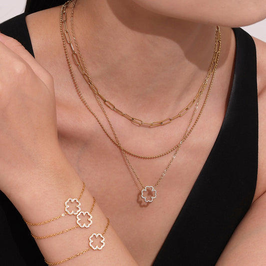B廠【TXP337】超閃5A鋯石四葉花小鑽手鍊耳環項鍊套組不鏽鋼精緻女士飾品 25.08-1