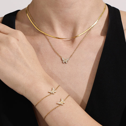 B廠【TXP336】夏季新款蝴蝶造型項鍊手鍊手鍊套組鑲嵌5A鋯石設計感不鏽鋼材質 25.08-1