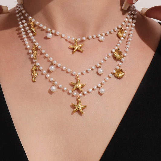 B廠【TXP335】海洋系列星星貝殼吊墜手工膠珠串珠項鍊手鍊手鍊套裝不銹鋼材質 25.08-1
