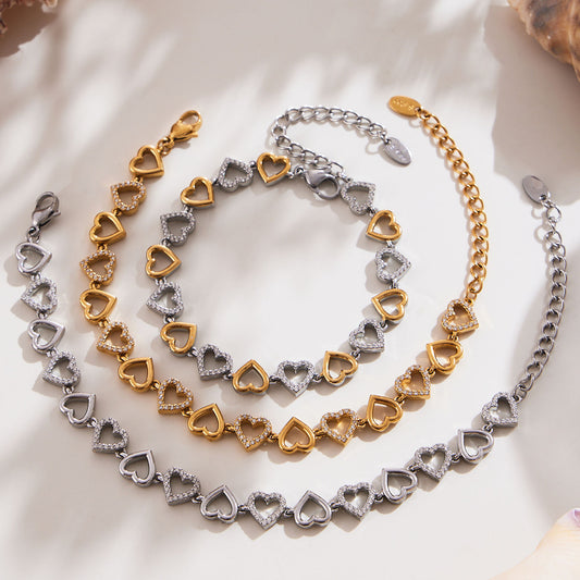 B廠【TXP417】跨境新款不鏽鋼滿鑽愛心手工鍊項鍊手鍊套組鍍18k真金飾品 25.10-1