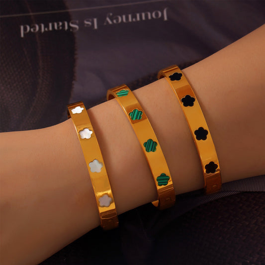 B廠【Z001】跨境新款韓版花朵飾品壓克力鈦鋼鍍金手鐲時尚簡約白海貝斯手環女式 24.05-2