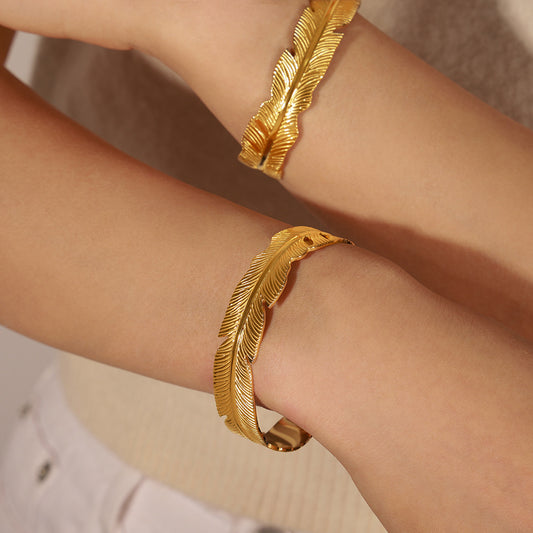 B廠【Z320-A350】INS風網紅同款18K金鈦鋼手飾寬麵設計感羽毛開口手鐲情侶時尚套裝 24.01-3