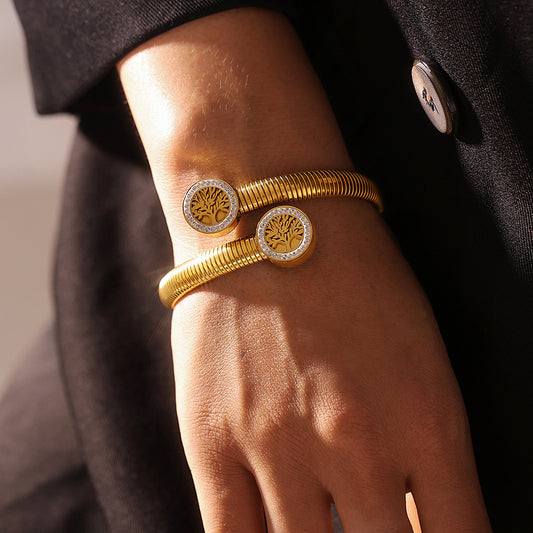 B廠【Z367】歐美跨境生命樹黏鑽螺紋開口手環 鈦鋼鍍18k金個性設計感環現貨 24.10-2
