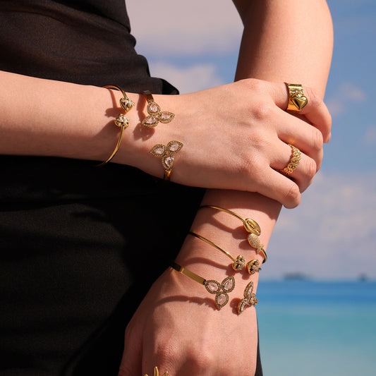 B廠【Z426】歐美INS風5A鋯石花朵帶鑽孔開口手鐲組合不鏽鋼鍍18k真金手鐲子 25.05-4