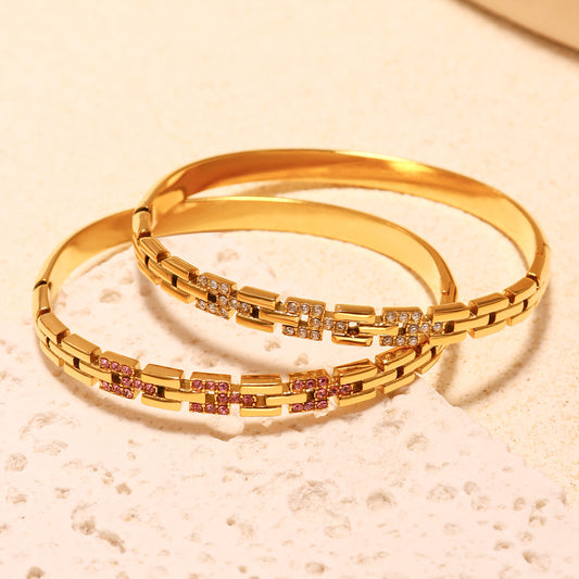 B廠【Z423】新款5A鋯石長城紋帶鑽超閃卡扣手鐲不鏽鋼鍍18k真金手鐲子潮 25.05-4