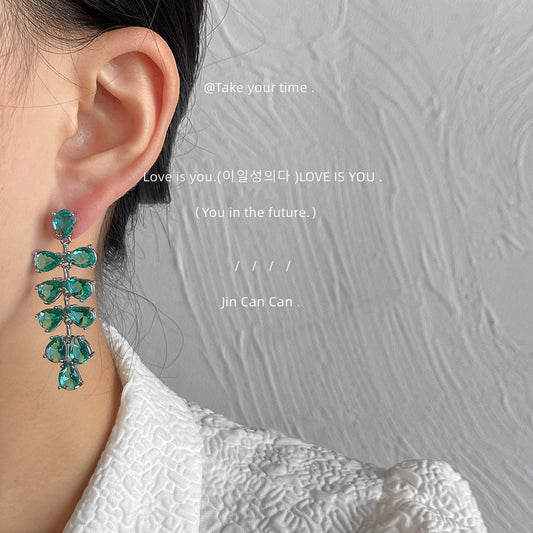 C廠【1306-1307】重工微鑲鋯石高級感手工流蘇水滴耳環森系彩寶綠長款輕奢樹葉耳飾 24.02-4