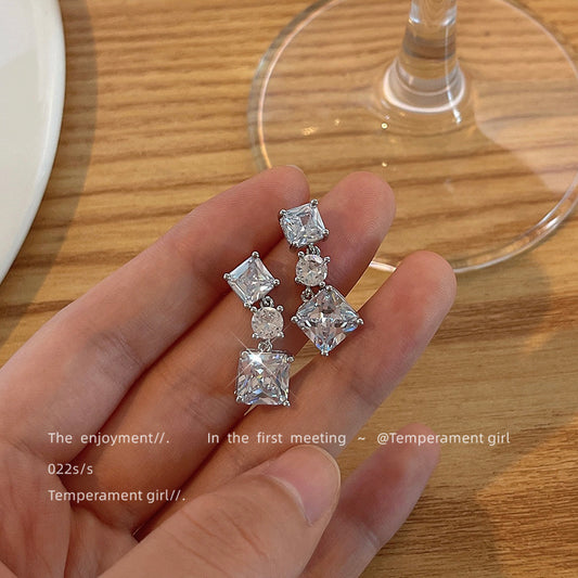C廠【1321】高級感微鑲鋯石方形手工耳環重工輕奢幾何長款流蘇晚宴風氣質耳飾 24.09-1