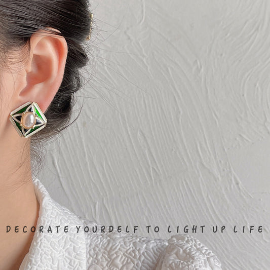 C廠【1125】中古風小眾設計感方形珍珠耳環高級感手工藝油復古優雅氣質耳飾女 24.01-2